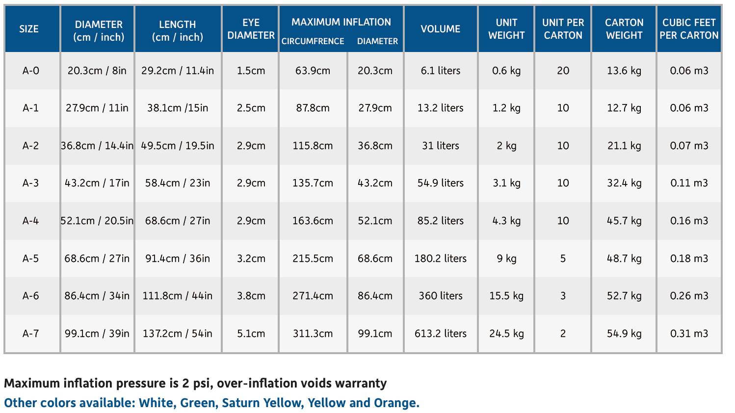 The A Series is the product that launched the Polyform story. This all-purpose buoy, with the signature “blue ropehold” has proven itself in the most adverse conditions. Marking gear used in heavy seas is no easy task. That’s why more shermen use Polyform A Series than all other buoys combined. you name it- ocean, sea, river or lake-and the A Series has been there. Put your trust in Polyform’s most versatile and well-known product. Maximum inflation pressure is 2 psi, over-inflation voids warranty Other colors available: White, Green, Saurn Yellow, Yellow, Orange.